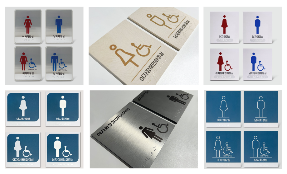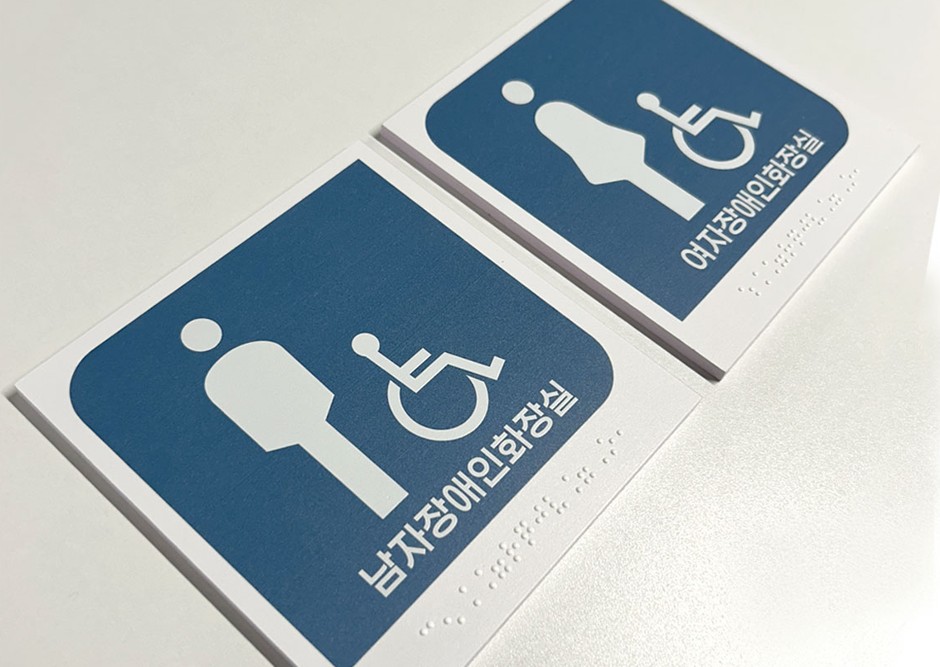 화장실의 출입구 옆 벽면의 1.5미터 높이에는 남자용과 여자용을 구별할 수 있는 점자표지판을 부착하여야합니다.
